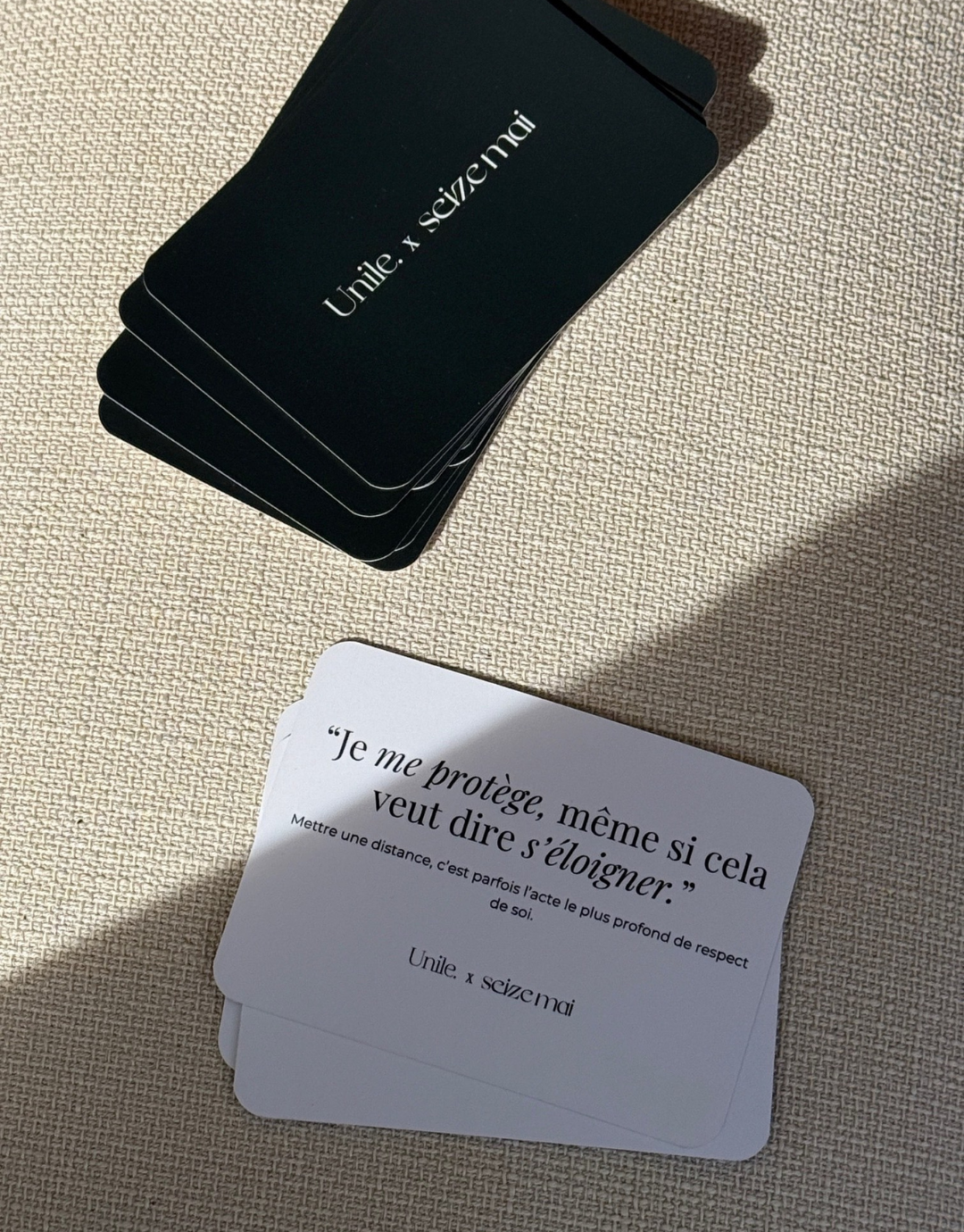 Né de notre ambition de se rapprocher de votre bien-être, nous souhaitions un objet signature qui s'ancre dans votre réalité pour vous rappeler chaque jour de vous écouter, de prendre un instant, et de souffler. Avec ce coffret intemporel et inspirant, s'alignant avec la philosophie d'Unile et de Seize-Mai, chaque carte devient une respiration, une intention à poser, et avant tout une manière de ramener douceur et conscience dans son quotidien.